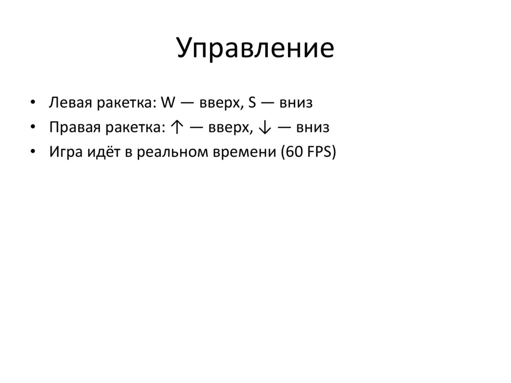 • Правая ракетка: ↑ — вверх, ↓ — вниз