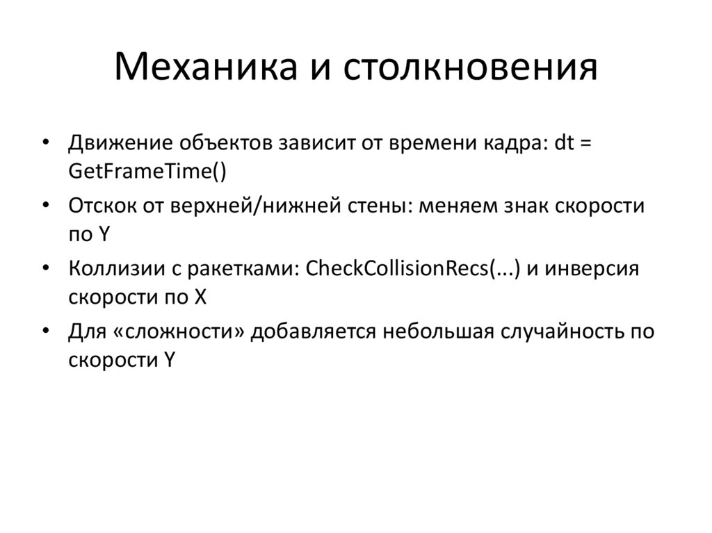 • Коллизии с ракетками: CheckCollisionRecs(...) и инверсия