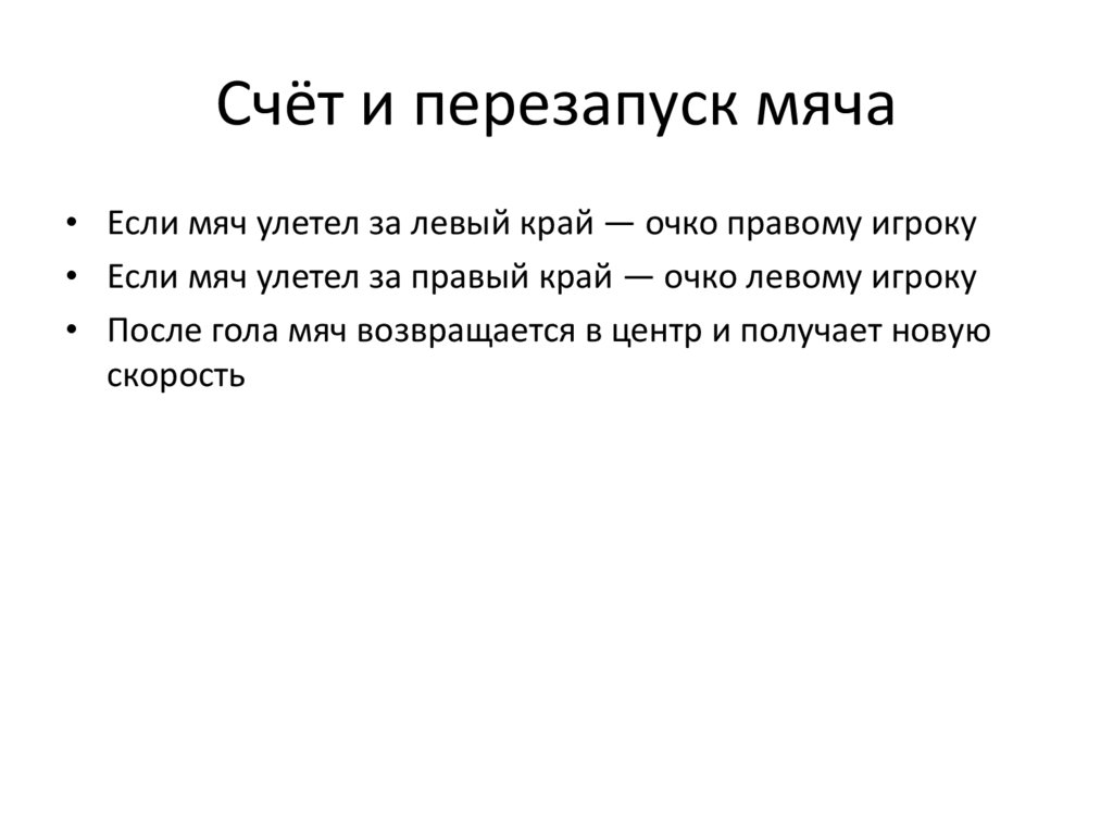 Счёт и перезапуск мяча• Если мяч улетел за левый край — очко правому игроку