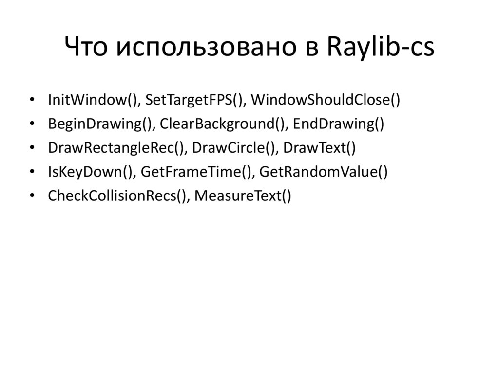 Что использовано в Raylib-csInitWindow(), SetTargetFPS(), WindowShouldClose()