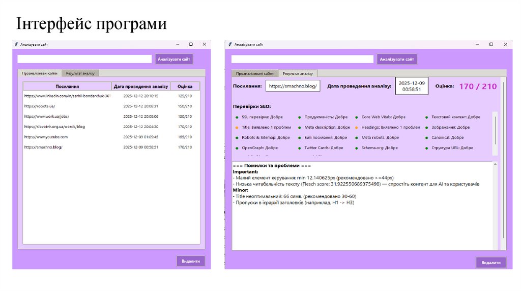 1. Розроблено автономну десктопну систему для аналізу SEO веб-сайтів, яказабезпечує комплексну перевірку понад 20 параметрів (технічних,