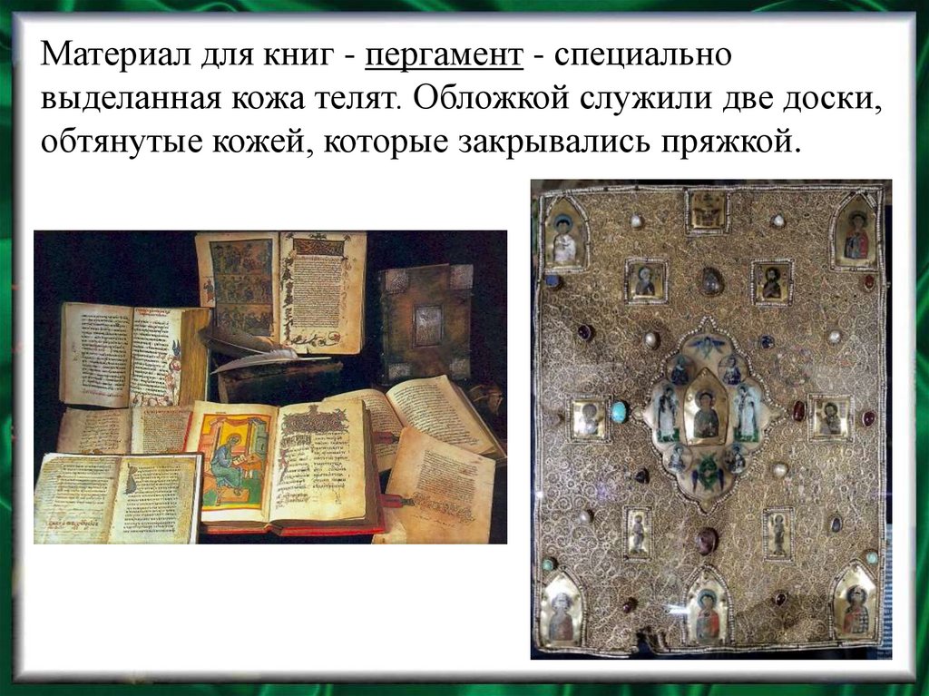 Материал для книг - пергамент - специальновыделанная кожа телят. Обложкой служили две доски,