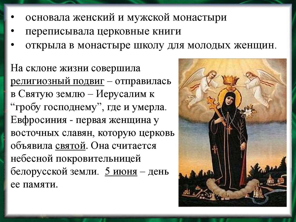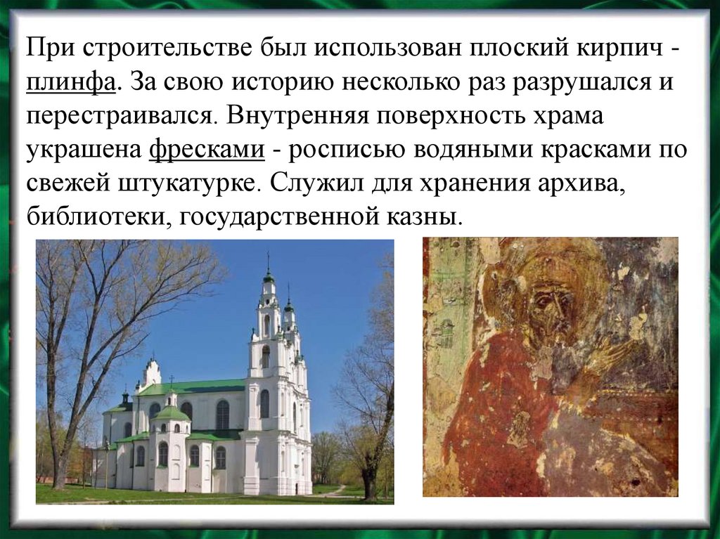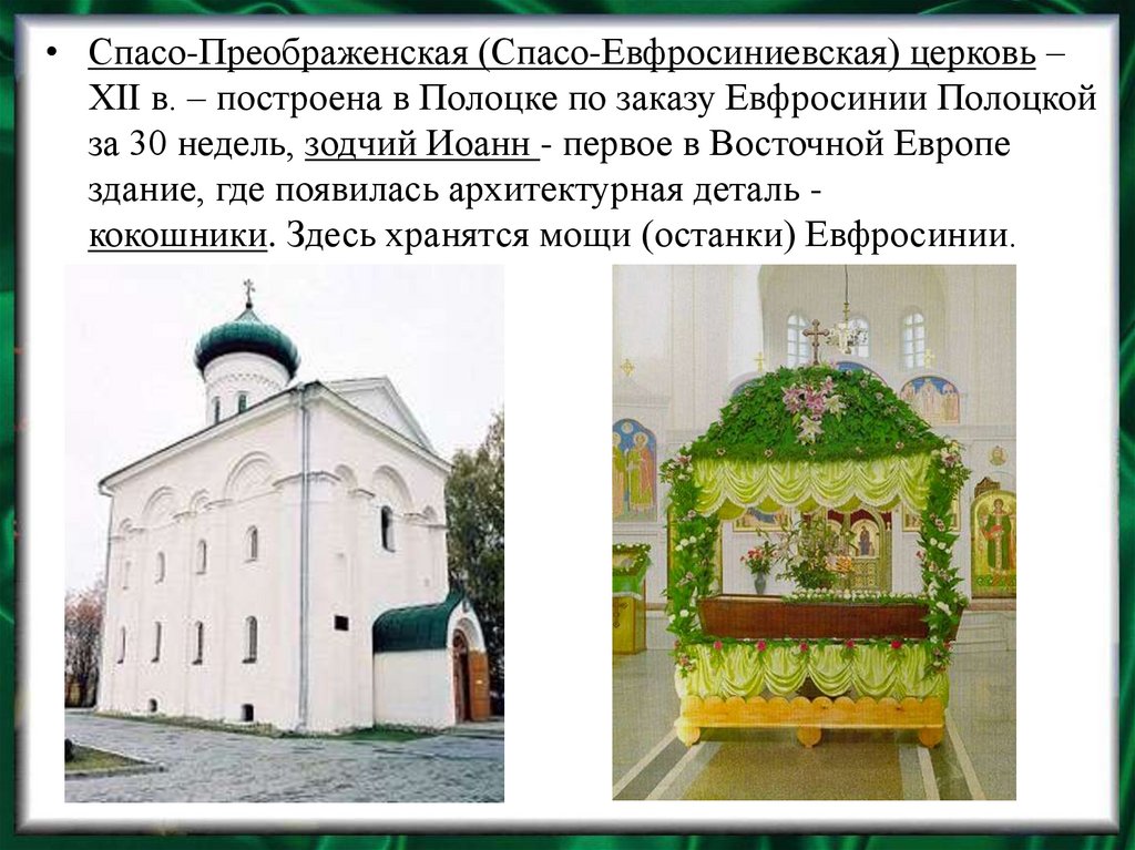 • Спасо-Преображенская (Спасо-Евфросиниевская) церковь –ХІІ в. – построена в Полоцке по заказу Евфросинии Полоцкой
