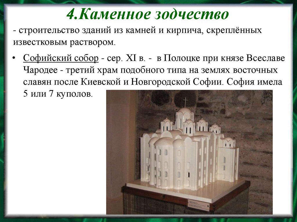 4.Каменное зодчество- строительство зданий из камней и кирпича, скреплённых