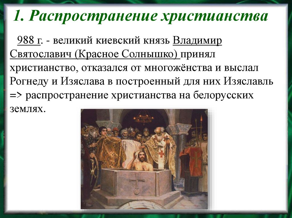 1. Распространение христианства988 г. - великий киевский князь Владимир