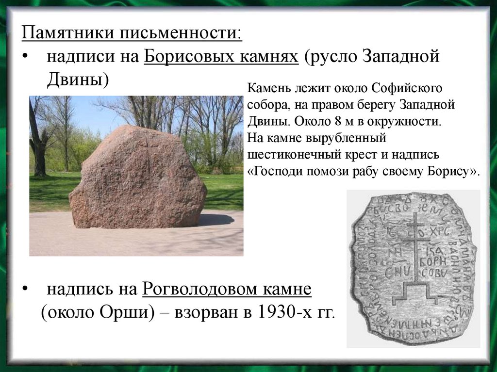 Памятники письменности:• надписи на Борисовых камнях (русло Западной