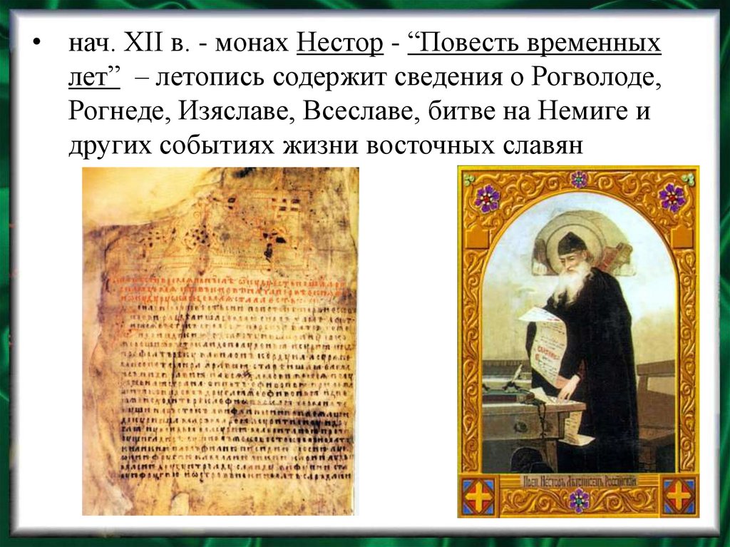 • нач. ХІІ в. - монах Нестор - “Повесть временныхлет” – летопись содержит сведения о Рогволоде,