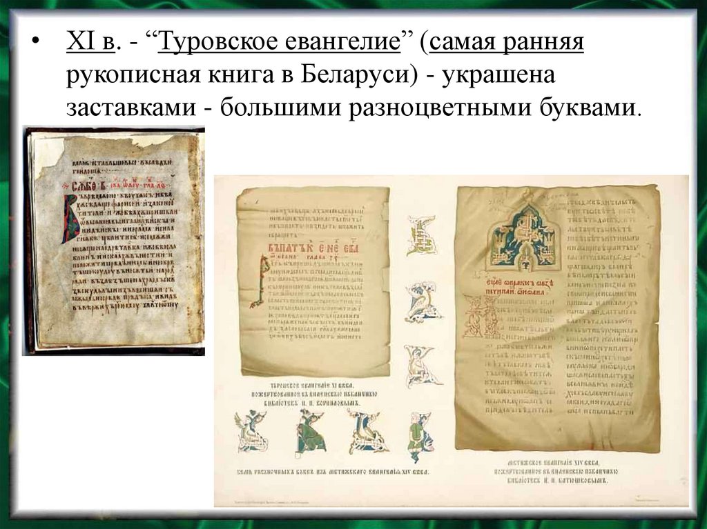 • ХІ в. - “Туровское евангелие” (самая ранняярукописная книга в Беларуси) - украшена