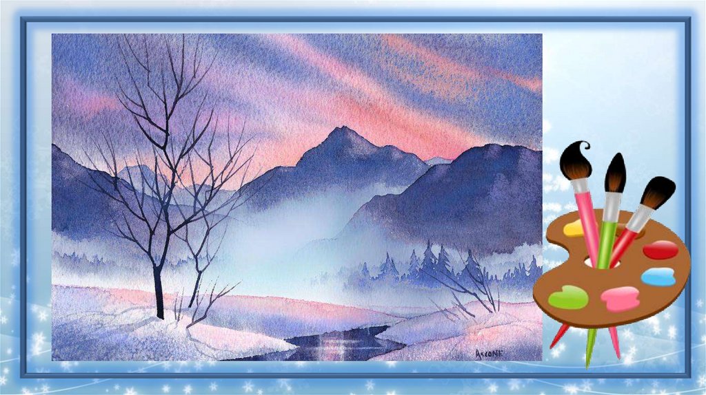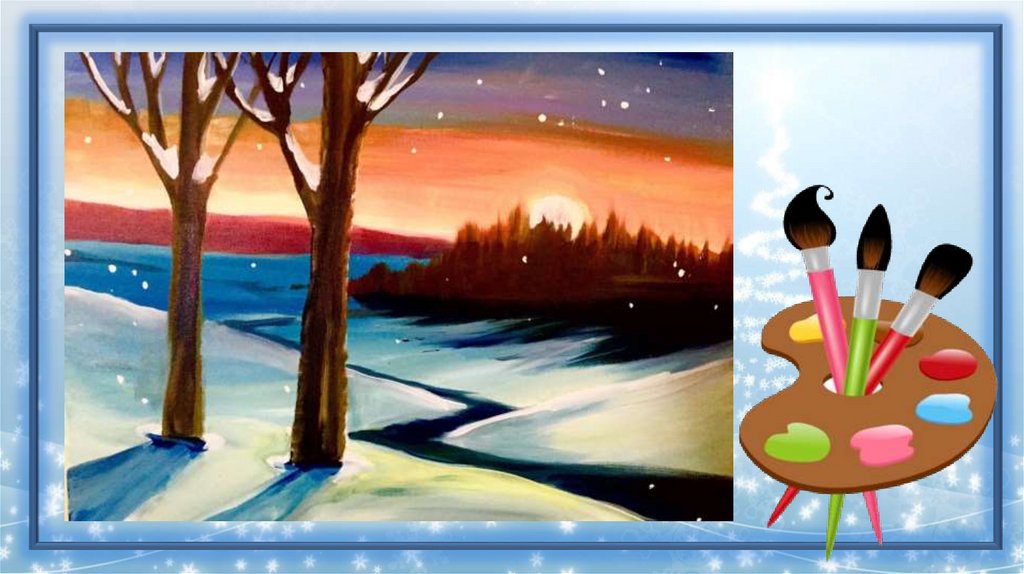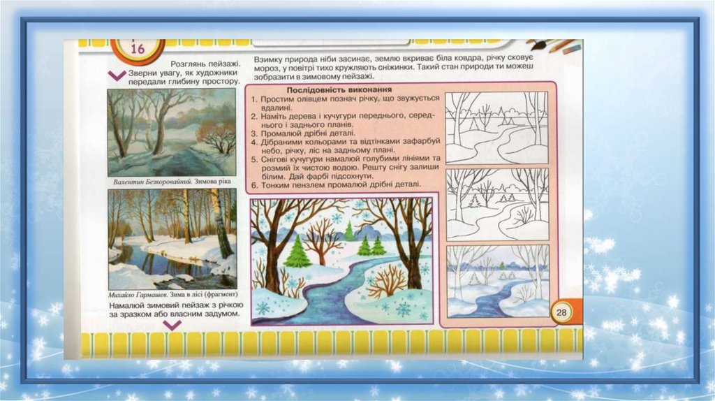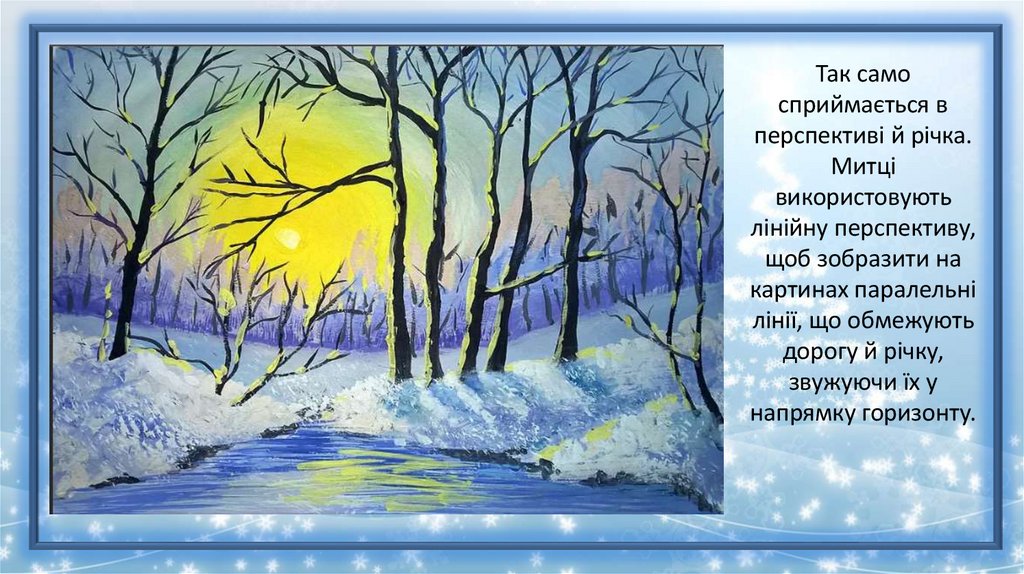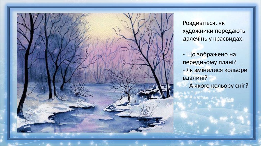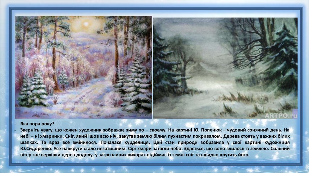 - Яка пора року?- Зверніть увагу, що кожен художник зображає зиму по – своєму. На картині Ю. Попенюк – чудовий сонячний день. На