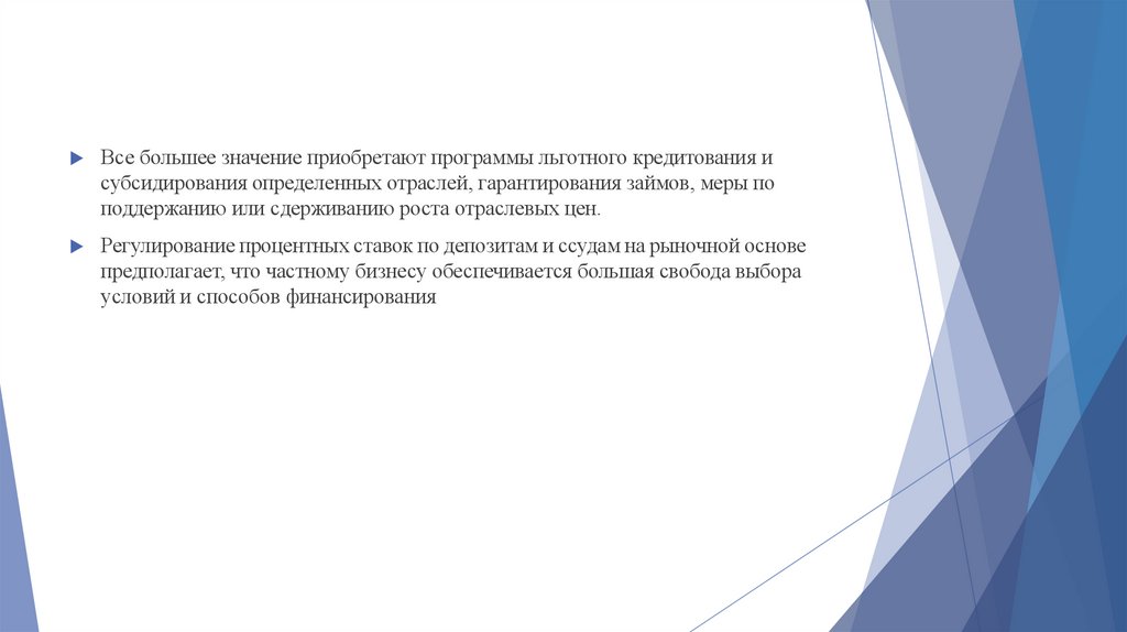 Все большее значение приобретают программы льготного кредитования исубсидирования определенных отраслей, гарантирования займов, меры по