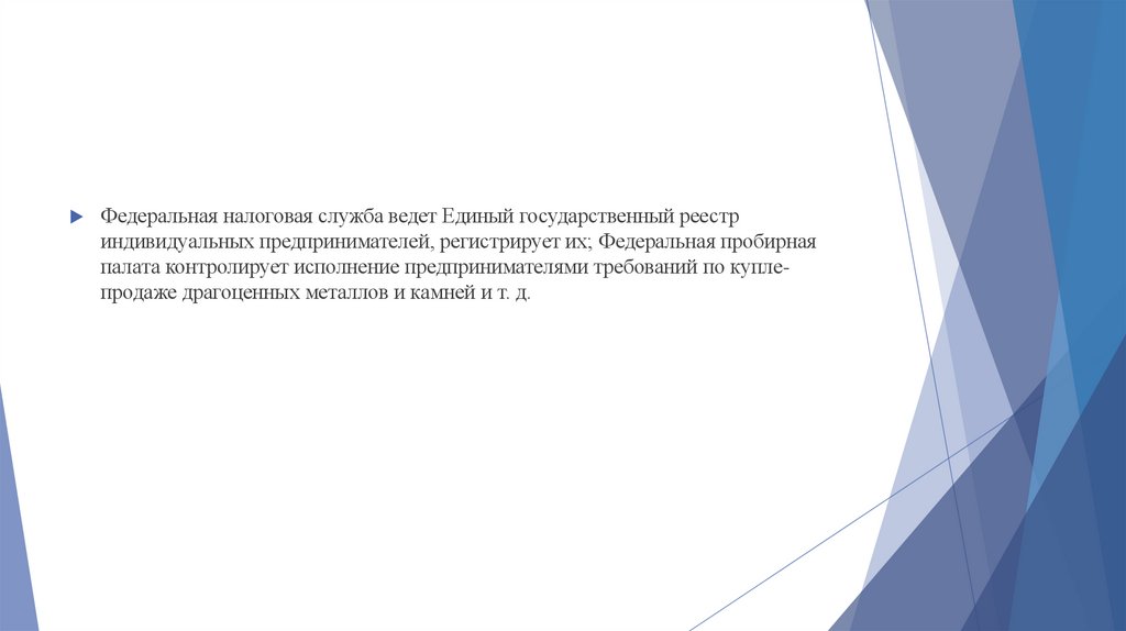 Федеральная налоговая служба ведет Единый государственный реестриндивидуальных предпринимателей, регистрирует их; Федеральная пробирная