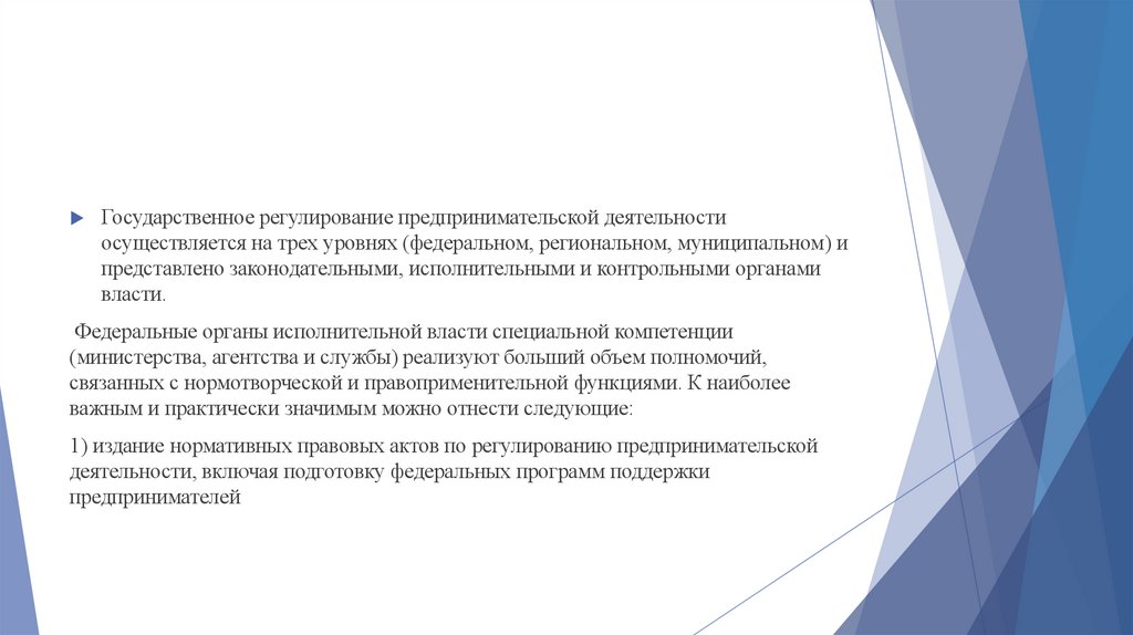 Государственное регулирование предпринимательской деятельностиосуществляется на трех уровнях (федеральном, региональном, муниципальном) и