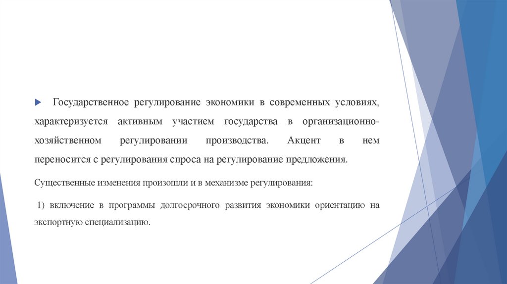 Государственное регулирование экономики в современных условиях,характеризуется активным участием государства в организационнохозяйственном