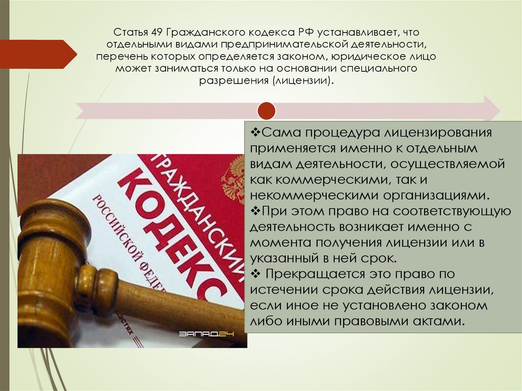 Статья 49 Гражданского кодекса РФ устанавливает, чтоотдельными видами предпринимательской деятельности,