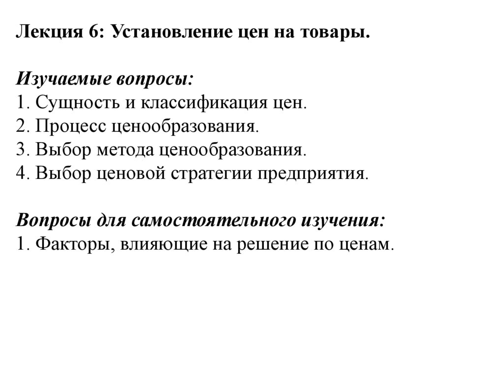 Лекция 6: Установление цен на товары.Изучаемые вопросы: