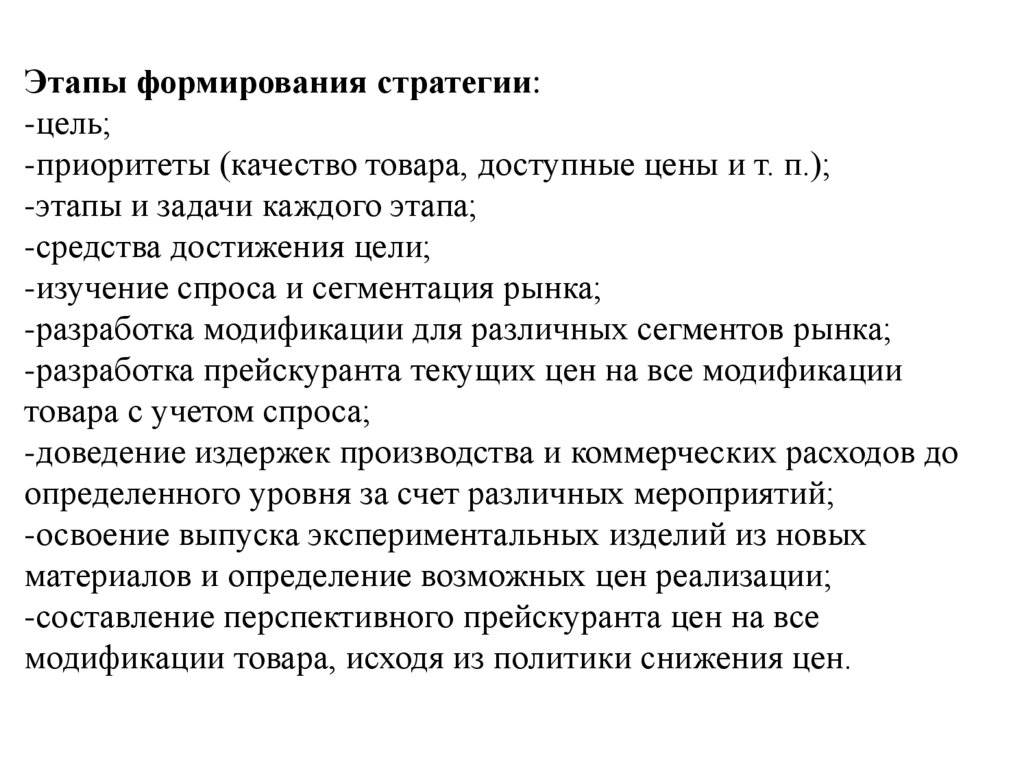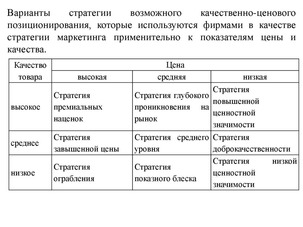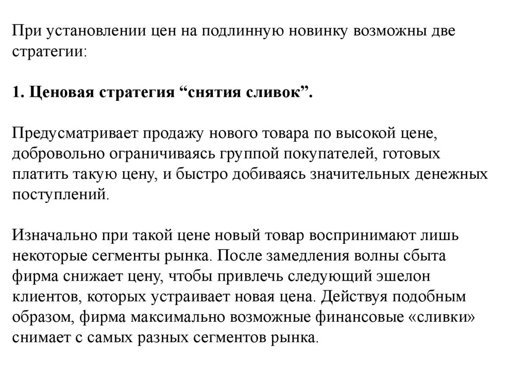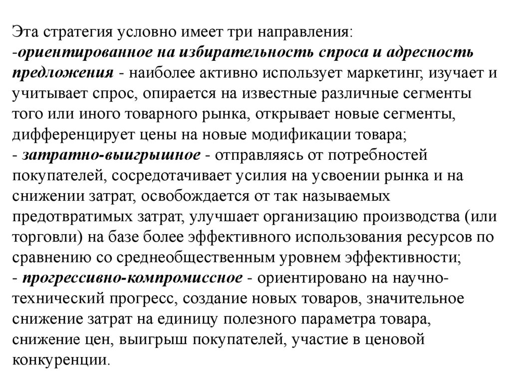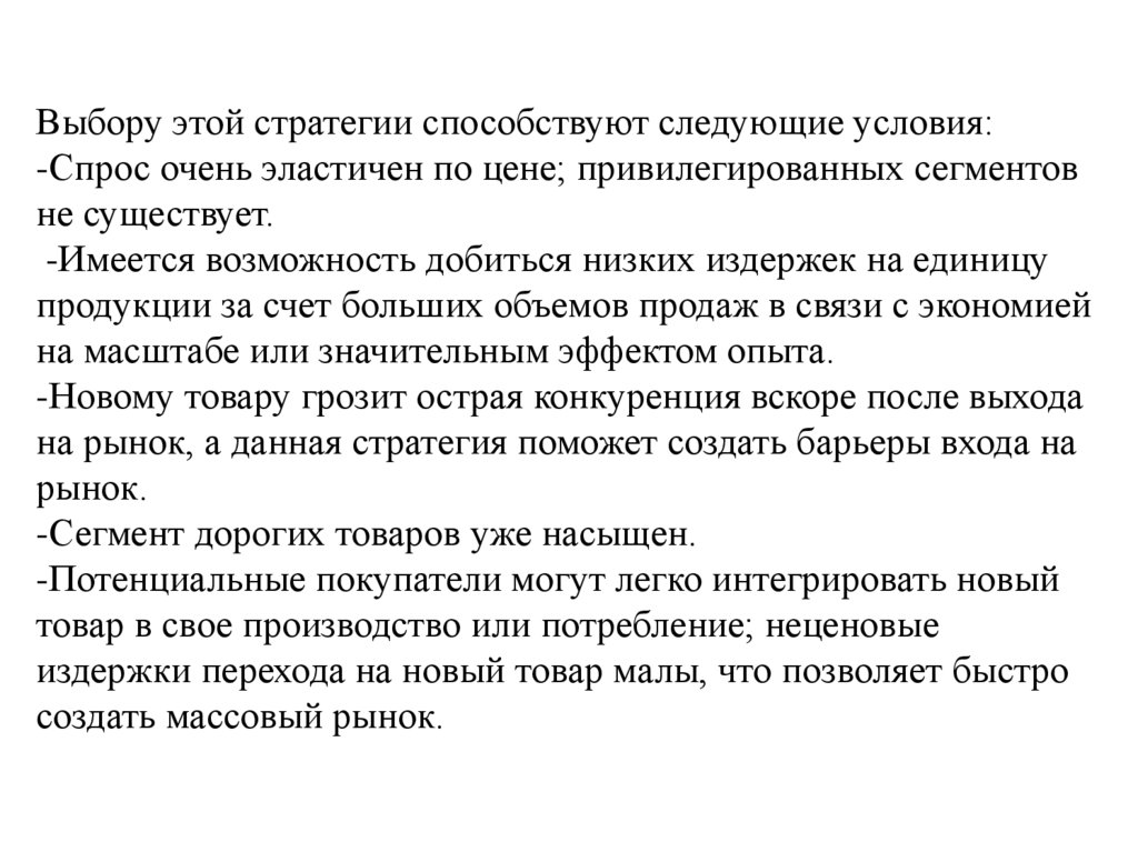 Выбору этой стратегии способствуют следующие условия:-Спрос очень эластичен по цене; привилегированных сегментов