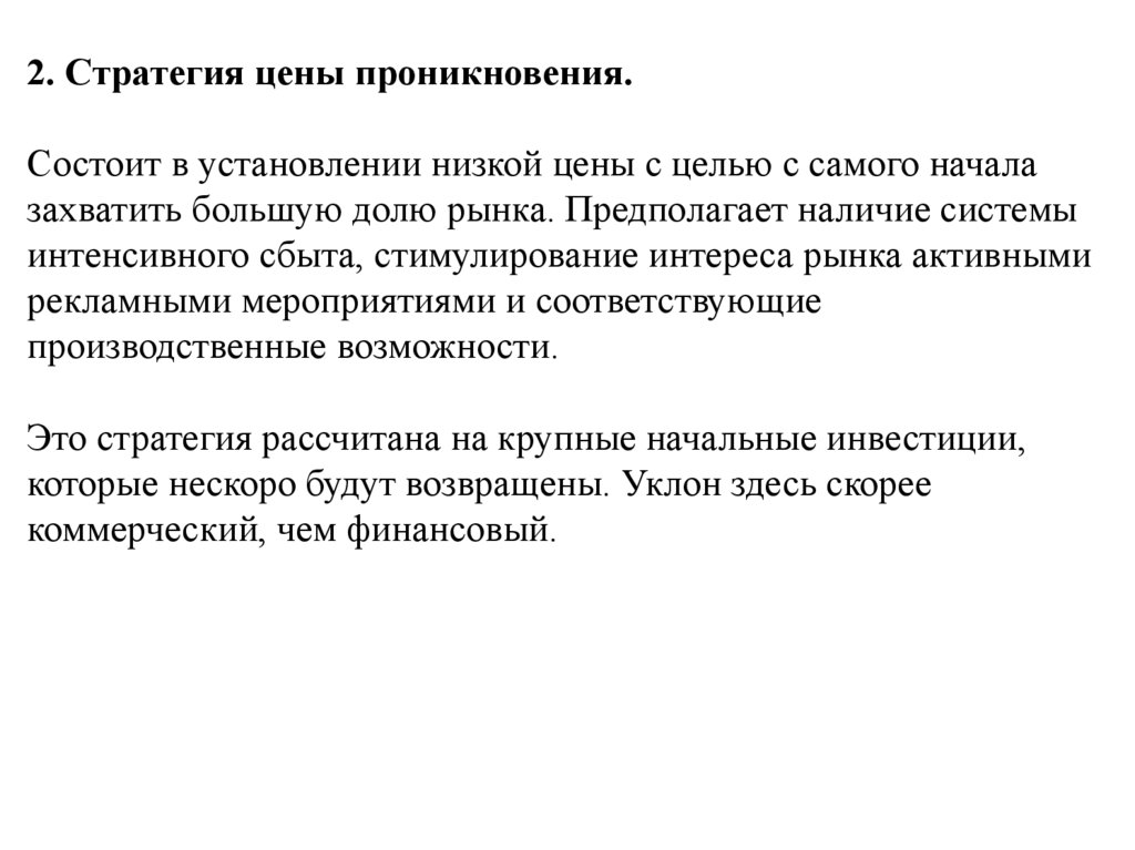 2. Стратегия цены проникновения.Состоит в установлении низкой цены с целью с самого начала