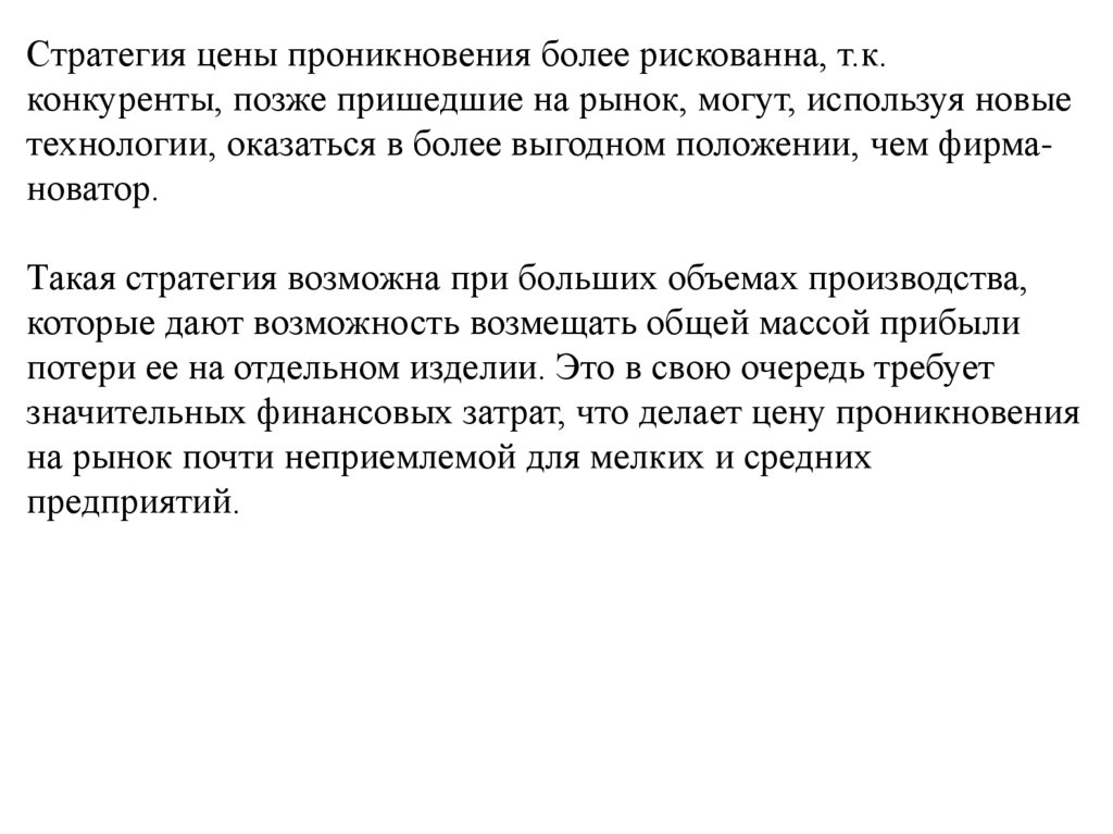 Стратегия цены проникновения более рискованна, т.к.конкуренты, позже пришедшие на рынок, могут, используя новые