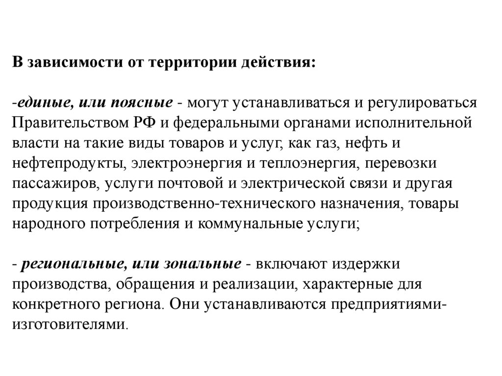 В зависимости от территории действия:-единые, или поясные - могут устанавливаться и регулироваться