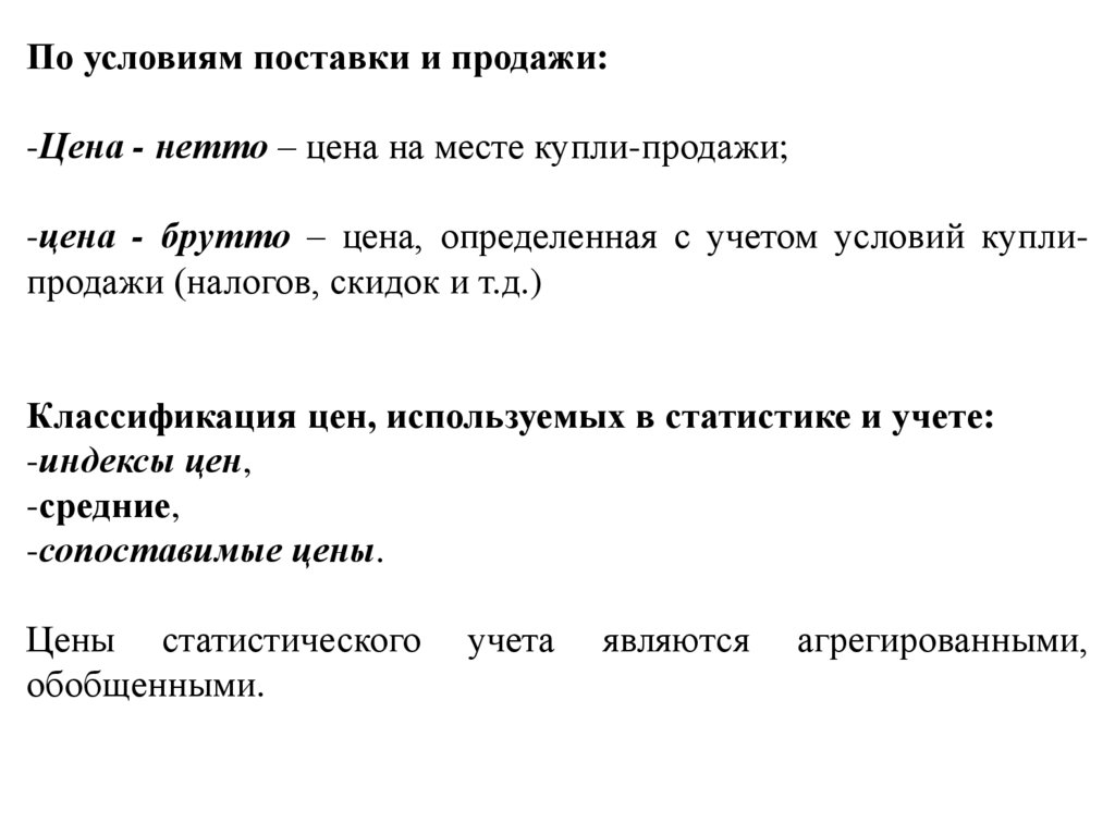 -цена - брутто – цена, определенная с учетом условий куплипродажи (налогов, скидок и т.д.)