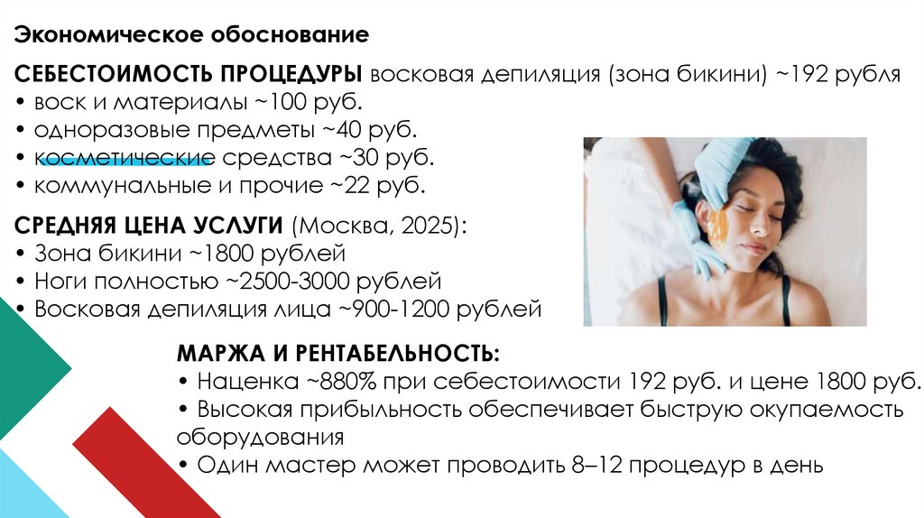 Экономическое обоснованиеСЕБЕСТОИМОСТЬ ПРОЦЕДУРЫ восковая депиляция (зона бикини) ~192 рубля