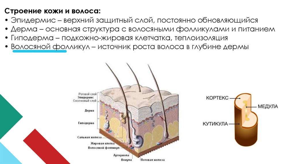 Строение кожи и волоса:• Эпидермис – верхний защитный слой, постоянно обновляющийся