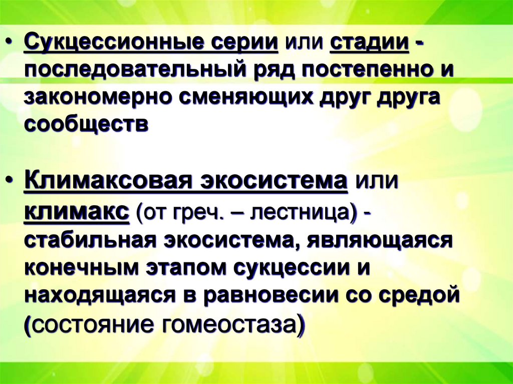 • Сукцессионные серии или стадии последовательный ряд постепенно изакономерно сменяющих друг друга