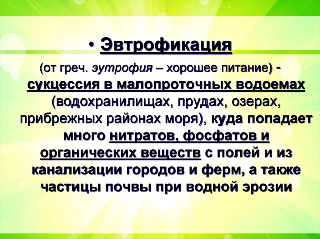 • Эвтрофикация(от греч. эутрофия – хорошее питание) -
