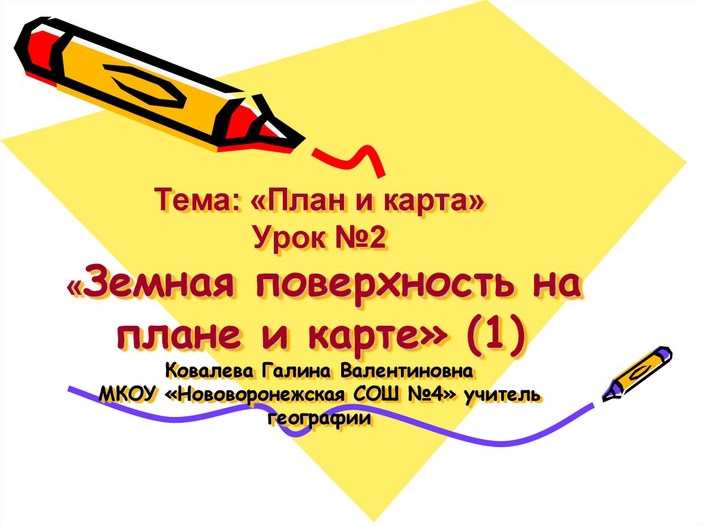 1. Тема: «План и карта» Урок №2 «Земная поверхность на плане и карте» (1) Ковалева Галина Валентиновна МКОУ «Нововоронежская СОШ