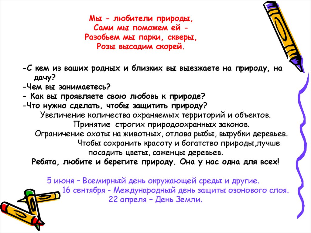 Мы - любители природы,Сами мы поможем ей Разобьем мы парки, скверы,