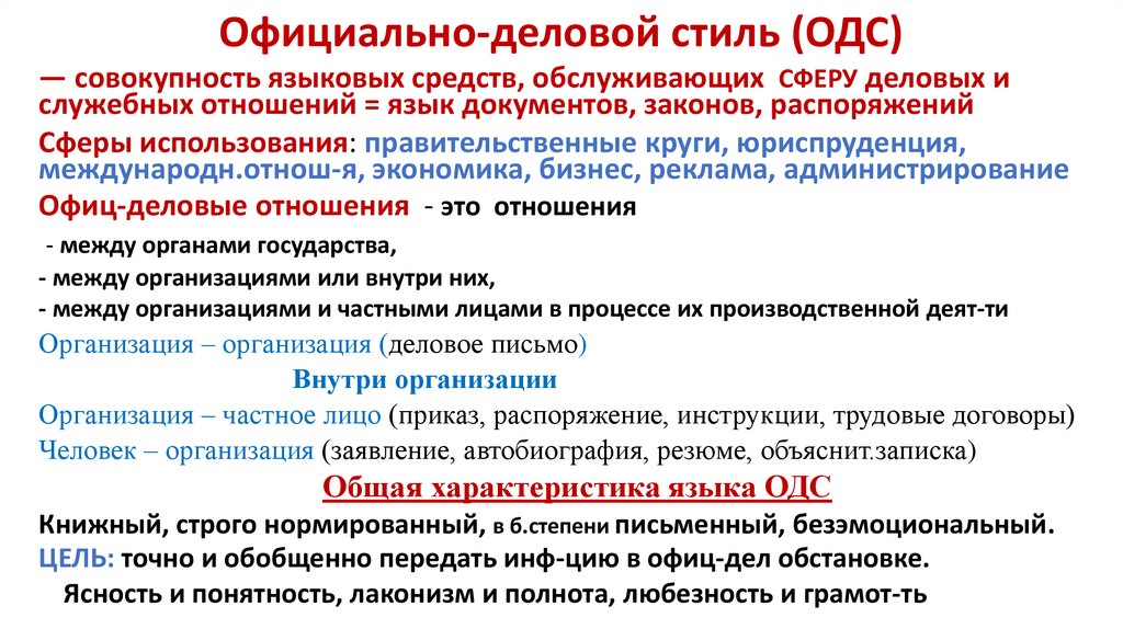 Официально-деловой стиль (ОДС)— совокупность языковых средств, обслуживающих СФЕРУ деловых и
