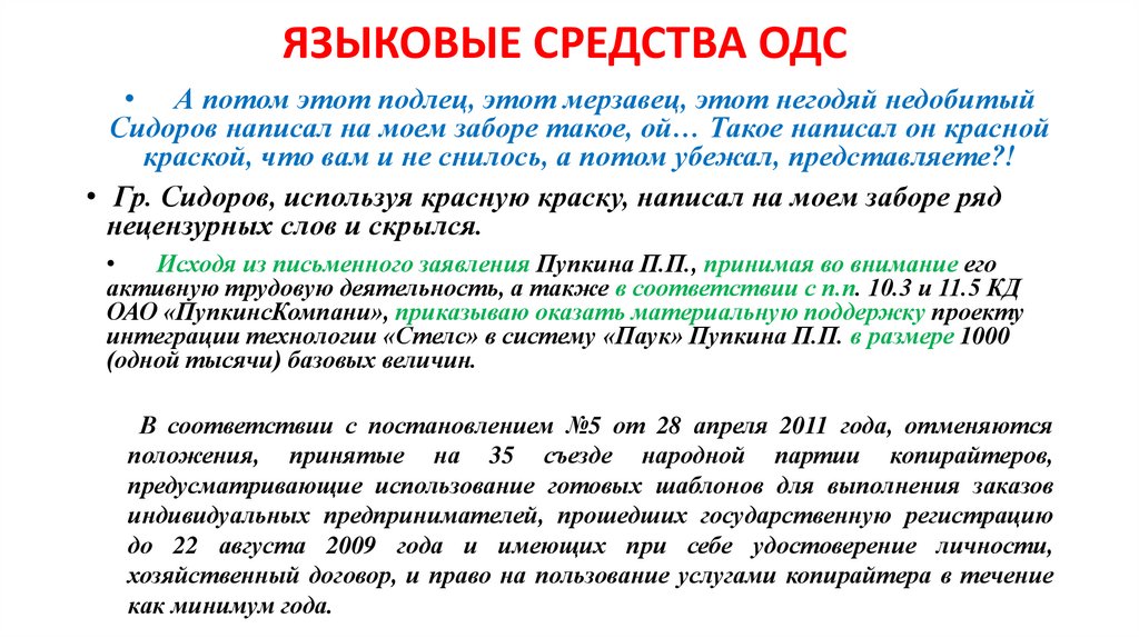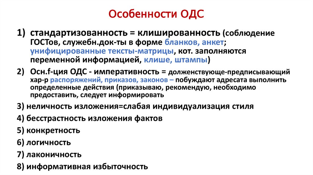 Особенности ОДС1) стандартизованность = клишированность (соблюдение