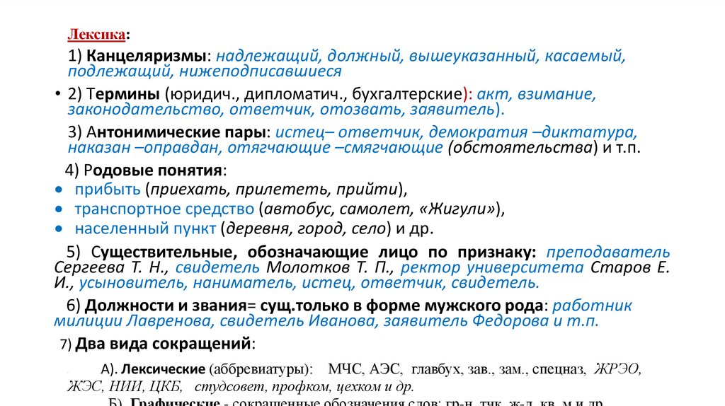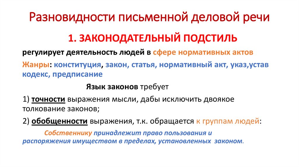 Разновидности письменной деловой речи1. ЗАКОНОДАТЕЛЬНЫЙ ПОДСТИЛЬ