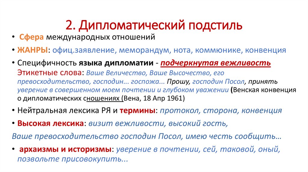 • ЖАНРЫ: офиц.заявление, меморандум, нота, коммюнике, конвенция