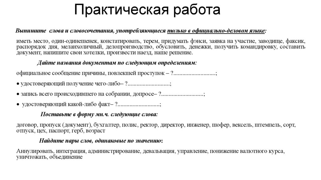 Практическая работаВыпишите слова и словосочетания, употребляющиеся только в официально-деловом языке:
