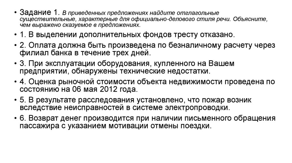 • Задание 1. В приведенных предложениях найдите отглагольныесуществительные, характерные для официально-делового стиля речи. Объясните,