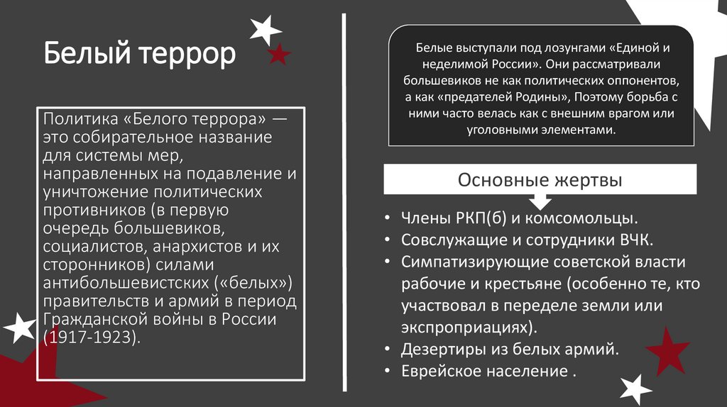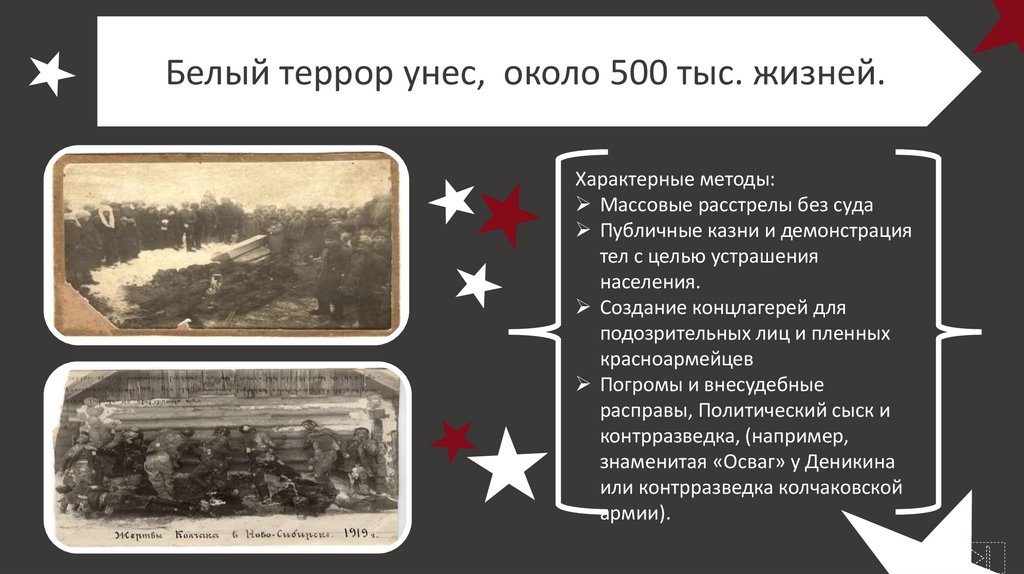 Белый террор унес, около 500 тыс. жизней.Характерные методы: