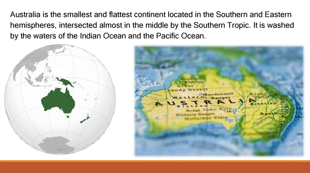 Australia is the smallest and flattest continent located in the Southern and Easternhemispheres, intersected almost in the middle by the Southern Tropic. It is washed