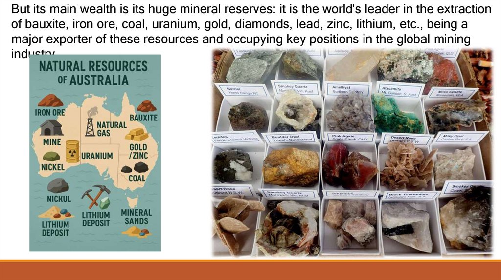 But its main wealth is its huge mineral reserves: it is the world's leader in the extractionof bauxite, iron ore, coal, uranium, gold, diamonds, lead, zinc, lithium, etc., being a