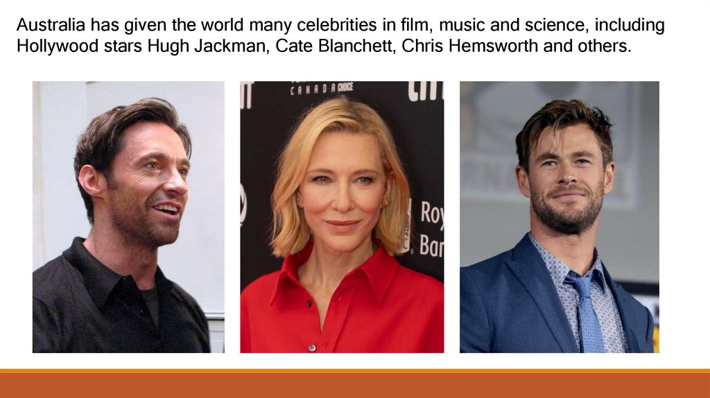 Australia has given the world many celebrities in film, music and science, includingHollywood stars Hugh Jackman, Cate Blanchett, Chris Hemsworth and others.
