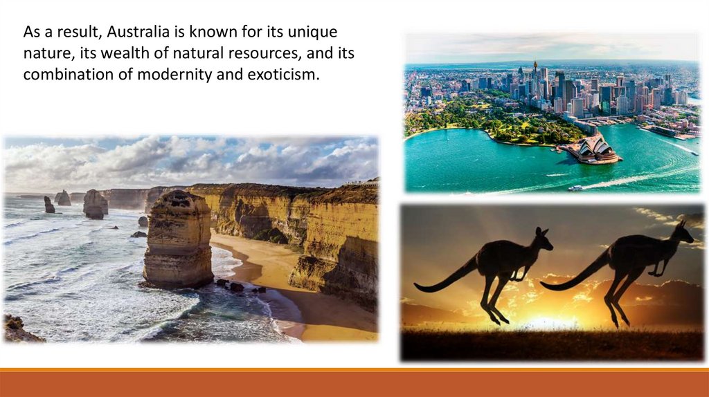 As a result, Australia is known for its uniquenature, its wealth of natural resources, and its