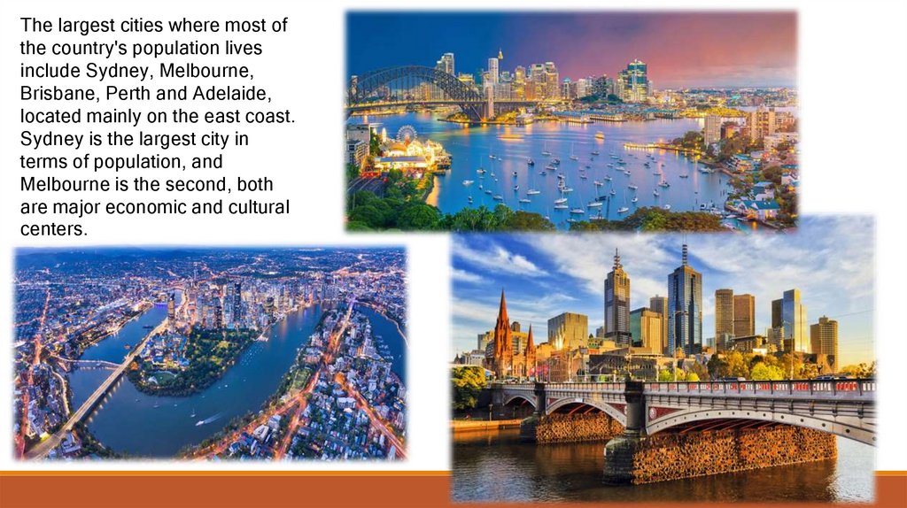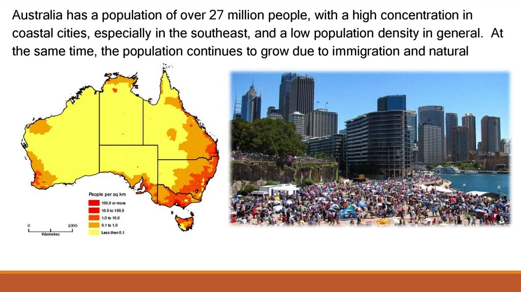 Australia has a population of over 27 million people, with a high concentration incoastal cities, especially in the southeast, and a low population density in general. At
