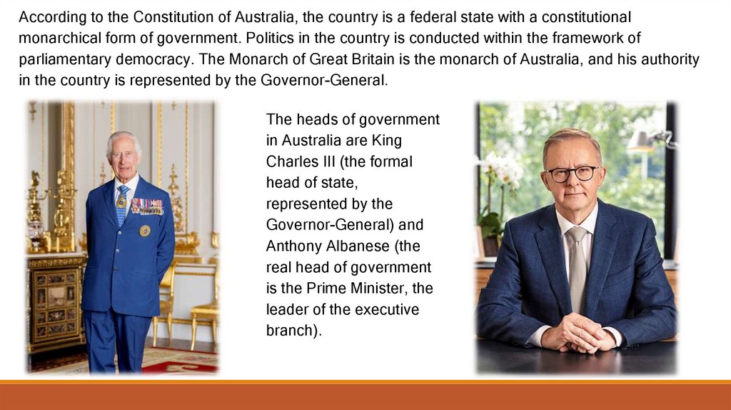 According to the Constitution of Australia, the country is a federal state with a constitutionalmonarchical form of government. Politics in the country is conducted within the framework of
