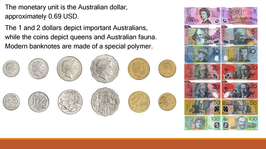 The monetary unit is the Australian dollar,approximately 0.69 USD.