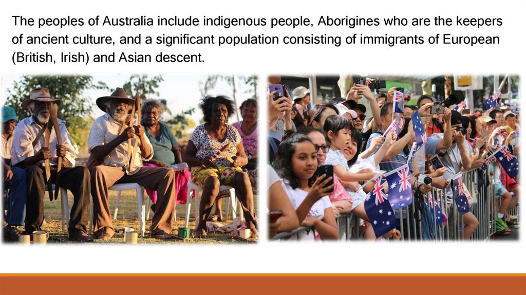 The peoples of Australia include indigenous people, Aborigines who are the keepersof ancient culture, and a significant population consisting of immigrants of European