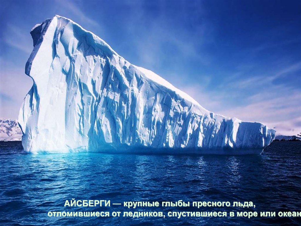 АЙСБЕРГИ — крупные глыбы пресного льда,отломившиеся от ледников, спустившиеся в море или океан