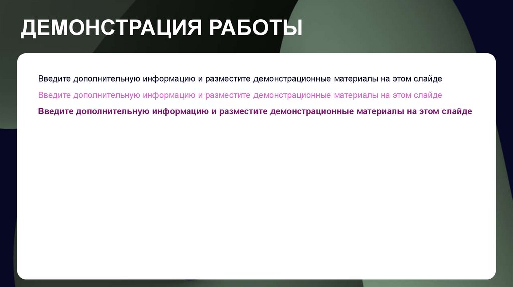 ДЕМОНСТРАЦИЯ РАБОТЫВведите дополнительную информацию и разместите демонстрационные материалы на этом слайде