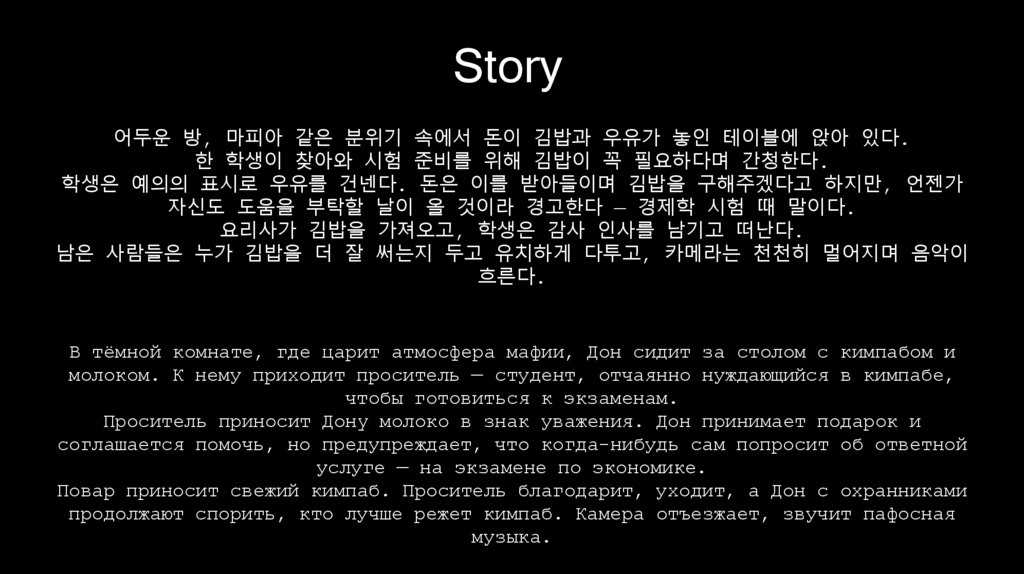 Story어두운 방, 마피아 같은 분위기 속에서 돈이 김밥과 우유가 놓인 테이블에 앉아 있다.