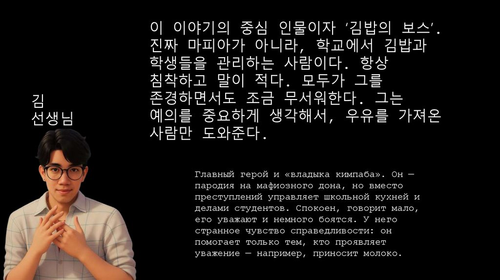 이 이야기의 중심 인물이자 ‘김밥의 보스’.