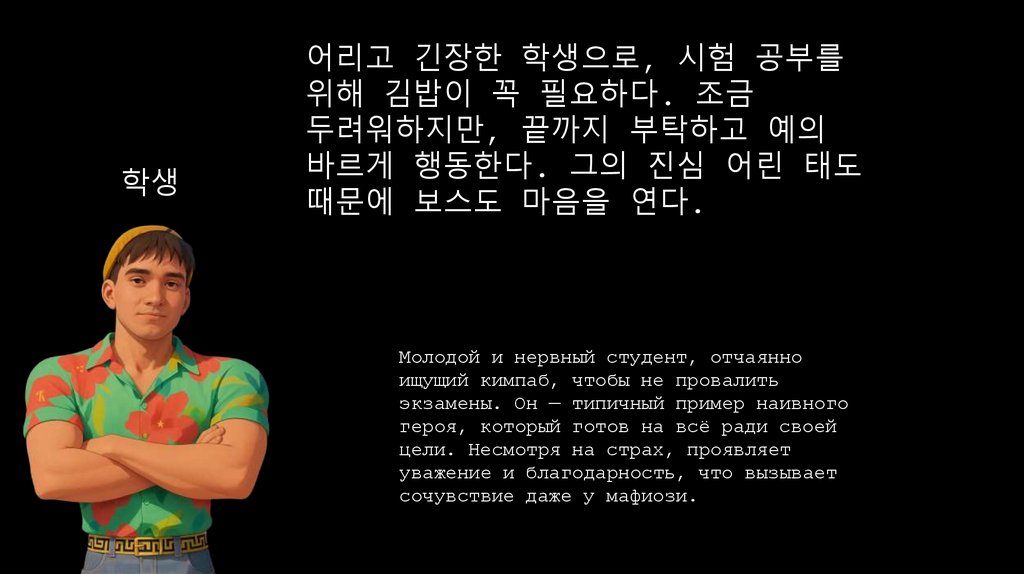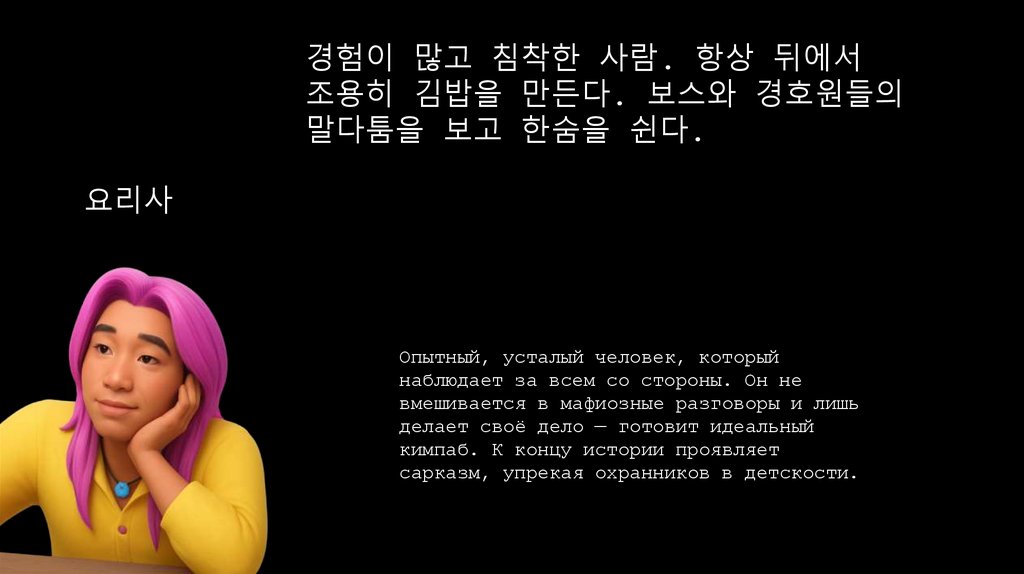 경험이 많고 침착한 사람. 항상 뒤에서조용히 김밥을 만든다. 보스와 경호원들의